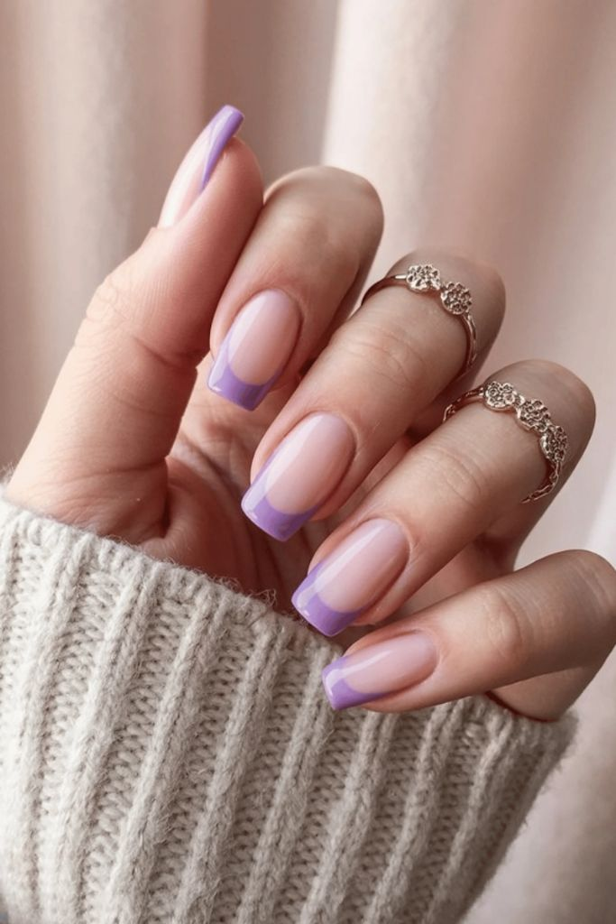 Lavender might be the most universally flattering spring color, and on these square nails, it’s giving the most serene, put-together energy. The tips are a dreamy pastel purple — not too warm, not too cool — and the base is that perfect milky pink that makes everything look harmonious. It’s the pastel french manicure that works whether you’re twenty-two or sixty-two. And the square shape keeps it from feeling too precious; there’s a groundedness to it that I really appreciate.