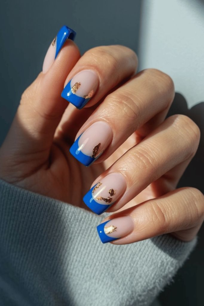 Gold foil nail art is easier than it looks. After painting your blue tips and letting them dry or cure, apply a thin layer of nail foil adhesive (the brand “Makartt” makes a great one) where you want the gold to land. Wait until the adhesive turns clear, then press gold foil sheets over it and peel away. The foil will only stick where the adhesive was applied. Seal with a glossy top coat.