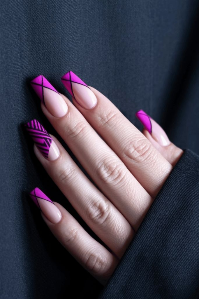 For anyone who thought French tips couldn’t be edgy, this design is a wake-up call. The coffin shape is bold on its own, but paired with hot pink tips covered in geometric black line art, it becomes something entirely unique. The crisscross pattern gives it a stained-glass or art-deco quality, while the nude base keeps the design from becoming chaotic. It’s controlled maximalism — a phrase I don’t use lightly — and it works because every element is intentional.