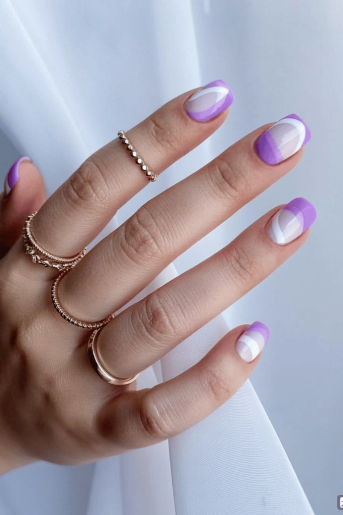 There’s something about lilac and white together that feels like the first day the windows stay open. These short, rounded nails feature an abstract version of the French tip where lilac and white sections overlap and divide the nail in playful, asymmetric ways. Some nails have more lilac, others more white, and the inconsistency is what makes it feel artistic rather than accidental. It’s the kind of cute flower-free spring nail that still feels garden-party appropriate.