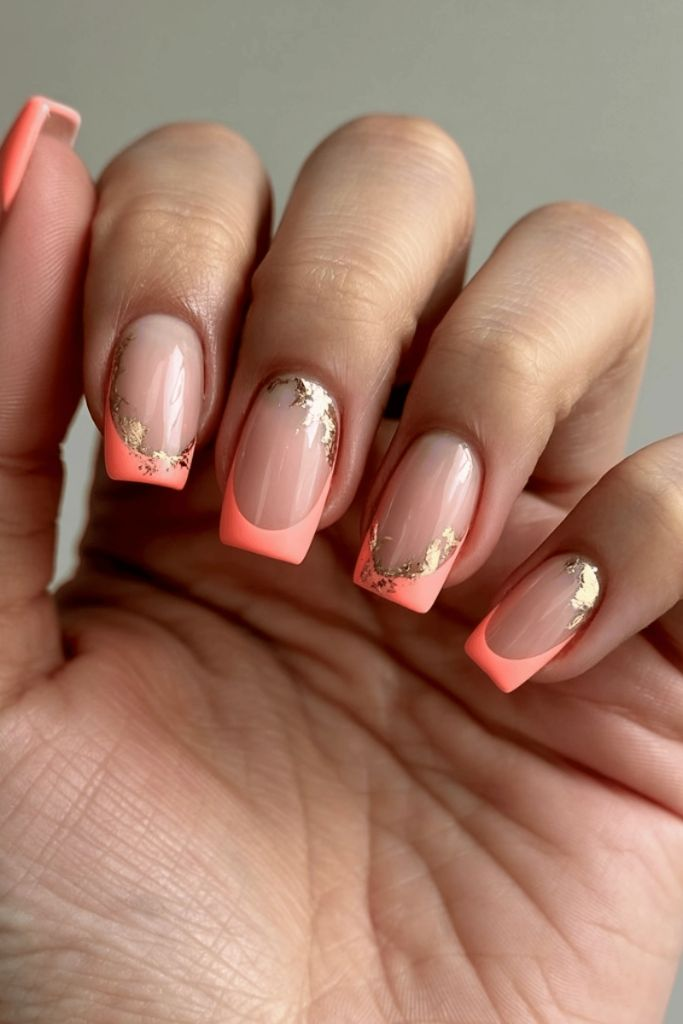 Coral is one of those colors that instantly makes me think of spring sunrises and blooming peonies, and on these short square nails, it’s pure warmth. The French tips are a soft peach-coral — not too orange, not too pink — and each nail has a small scatter of gold leaf flakes placed organically near the tip line. The effect is romantic and luminous, like pressing a golden petal into wet polish. For short french tip nail ideas that feel inherently springlike, this is the gold standard.