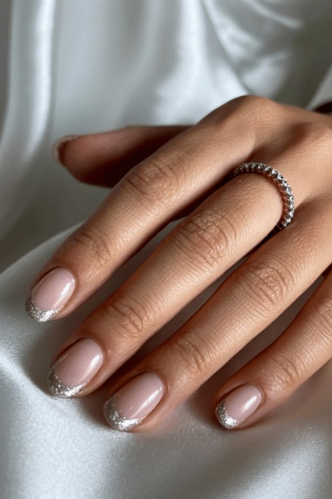 This is the quietest design in this entire collection, and it might also be my favorite. The micro french tip — just the thinnest line of silver glitter at each nail’s edge — is so subtle that you almost need to look twice to see it. But once you do, it’s mesmerizing. The silver catches light from every angle, creating this delicate halo effect that makes short, natural nails look polished and luminous without a drop of actual color. It’s minimalist french tip nails in their purest form.