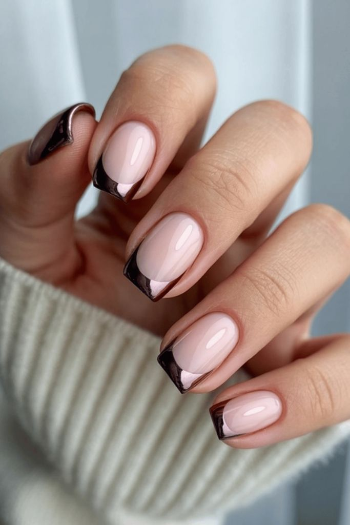 Essie “Chocolate Cakes” or OPI “Squeaker of the House” will give you this deep, warm brown. For the angled line, use a single piece of striping tape placed diagonally across the nail. One coat of brown on the exposed tip, remove the tape, and you’ve got that clean geometric edge. A glossy top coat is essential here — matte brown French tips can look muddy, but glossy brown looks expensive.
