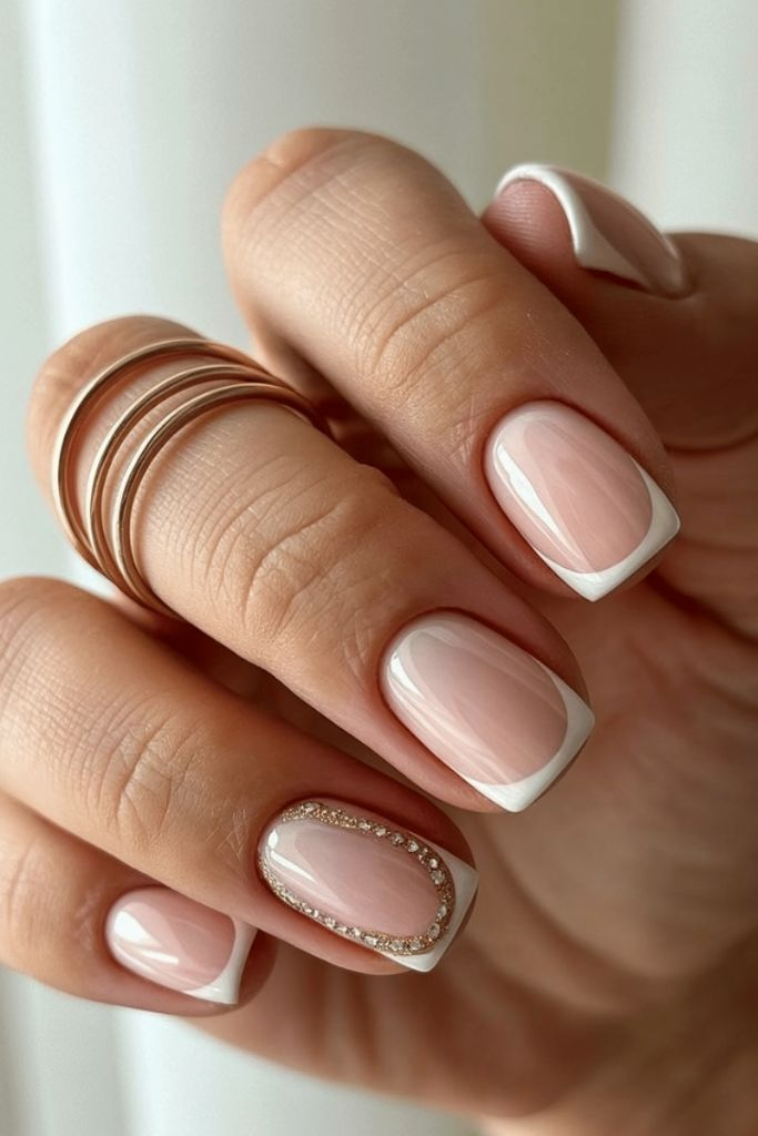 There will always be a place for the classic white French manicure, and this version elevates it with a single, stunning accent. Four nails carry the traditional white tip over a warm nude base — clean, timeless, impeccable — while one nail features a delicate arc of tiny rhinestones or micro glitter following the French line. It’s the perfect balance between tradition and embellishment, and it’s the kind of simple elegant nail design that works for absolutely any spring occasion.