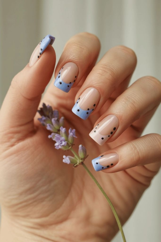 We’re ending on a playful note with this periwinkle polka dot French that feels like the nail equivalent of a sundress. The soft blue tips are cheerful on their own, but the tiny black dots scattered along and around the French line add a whimsical, hand-drawn quality that makes this look entirely unique. The short square shape keeps it practical, and the nude base ensures it doesn’t veer into costume territory. It’s spring floral french nails’ more abstract cousin — dotty, delightful, and full of personality.