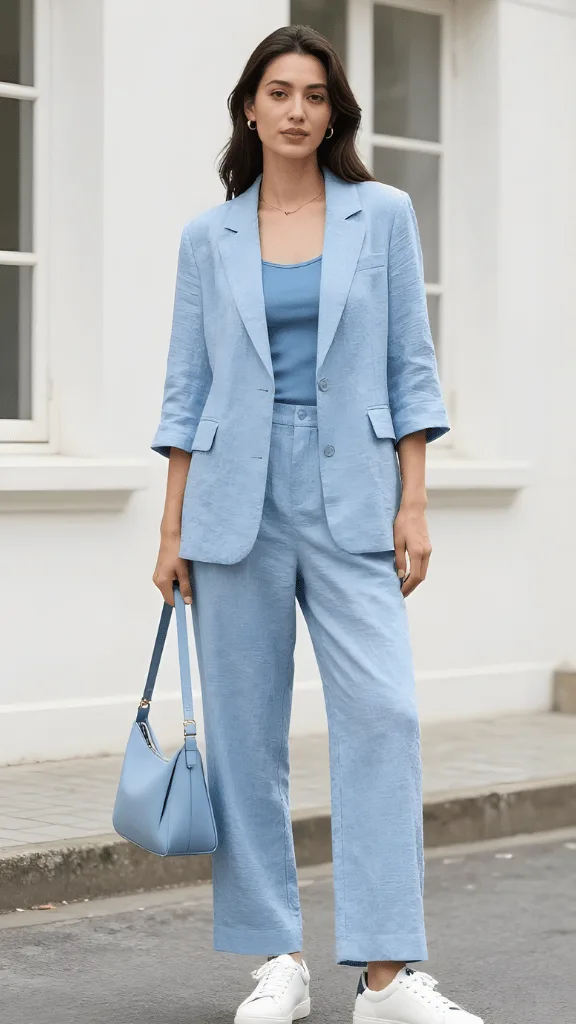 Soft, serene, and utterly sophisticated, this sky blue suit captures the essence of quiet luxury spring outfits 2026 beautifully. The relaxed linen blazer and matching wide-leg trousers create a cohesive look that feels polished yet approachable. A coordinating blue tank beneath and matching shoulder bag maintain the tonal story while white sneakers add contemporary ease.