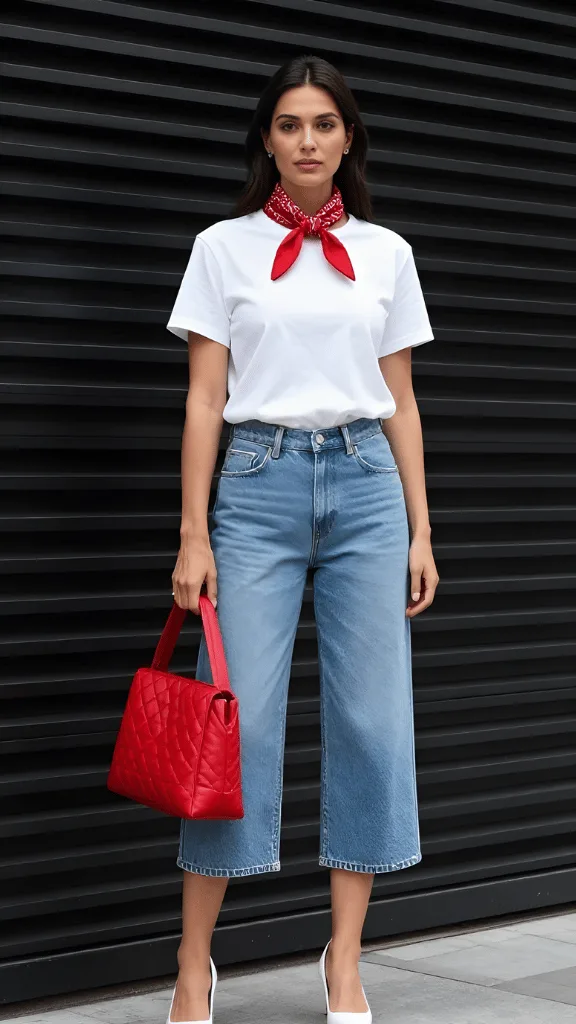 Classic American sportswear meets Parisian flair in this denim with red accessories spring outfit that proves basics become extraordinary through strategic styling. A simple white crew neck tee tucked into light wash wide-leg jeans forms the foundation, but the red accessories transform everything. A printed red bandana tied at the neck, a quilted red handbag, and white heels create a look that feels both nostalgic and completely current.