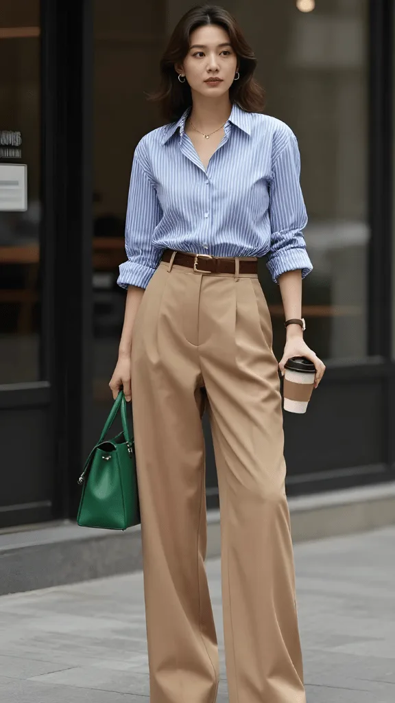 Few combinations embody European style quite like the pairing of a crisp striped shirt with beautifully tailored camel trousers. This stripes with camel trousers spring look is the epitome of polished sophistication without trying too hard. The blue and white vertical stripes elongate the silhouette while the warm camel tone grounds the outfit in earthy elegance. Notice how the sleeves are casually rolled to three-quarter length, adding that effortless touch that separates good style from great style.