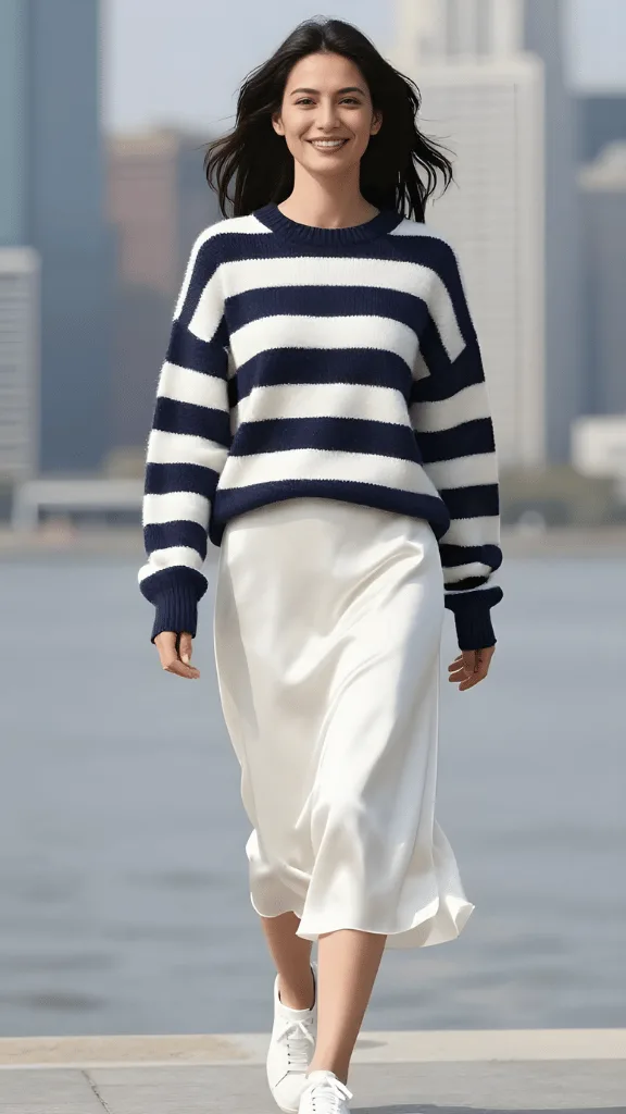 Nautical stripes meet feminine fluidity in this effortlessly chic combination that screams coastal European glamour. The navy and white striped knit sweater brings casual comfort while the ivory satin midi skirt introduces an element of luxurious sophistication. This juxtaposition of textures and styles is what makes modern European spring outfits 2026 so captivating. It is unexpected yet completely harmonious.