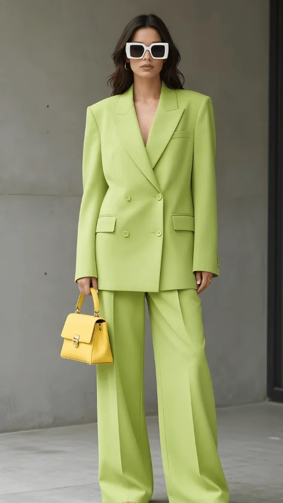 Bold color is having its moment, and this soft citrus suiting spring capsule look proves that vibrant hues can be just as sophisticated as traditional neutrals. This lime green double-breasted suit commands attention without sacrificing elegance. The structured shoulders and classic suiting details keep the look grounded in professionalism, while the electric shade announces confidence and individuality.