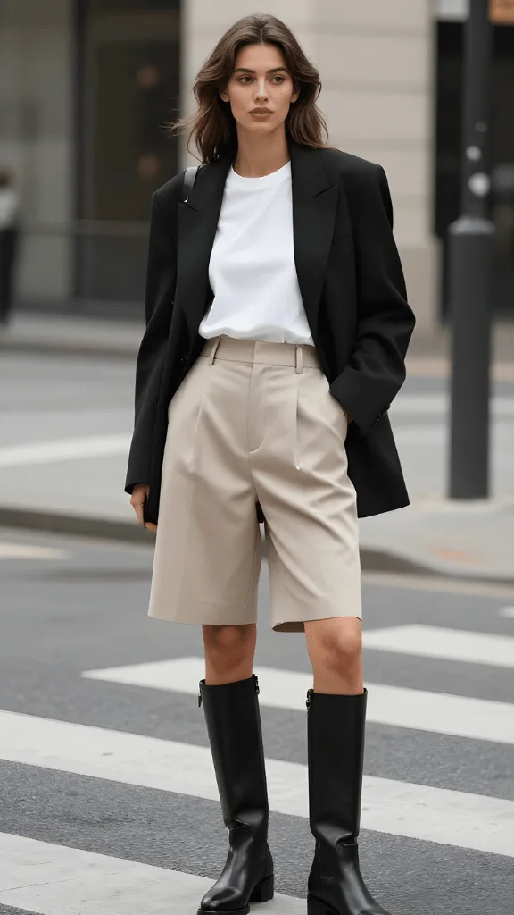 The intersection of casual and polished has never looked better than in this cream blazer with denim shorts spring interpretation. An oversized black blazer transforms simple beige tailored shorts into something runway-worthy. The proportions play tricks on the eye, with the lengthy blazer creating visual balance against the exposed leg. Add knee-high black leather riding boots, and you have a look that works beautifully for those unpredictable spring days when temperatures fluctuate.