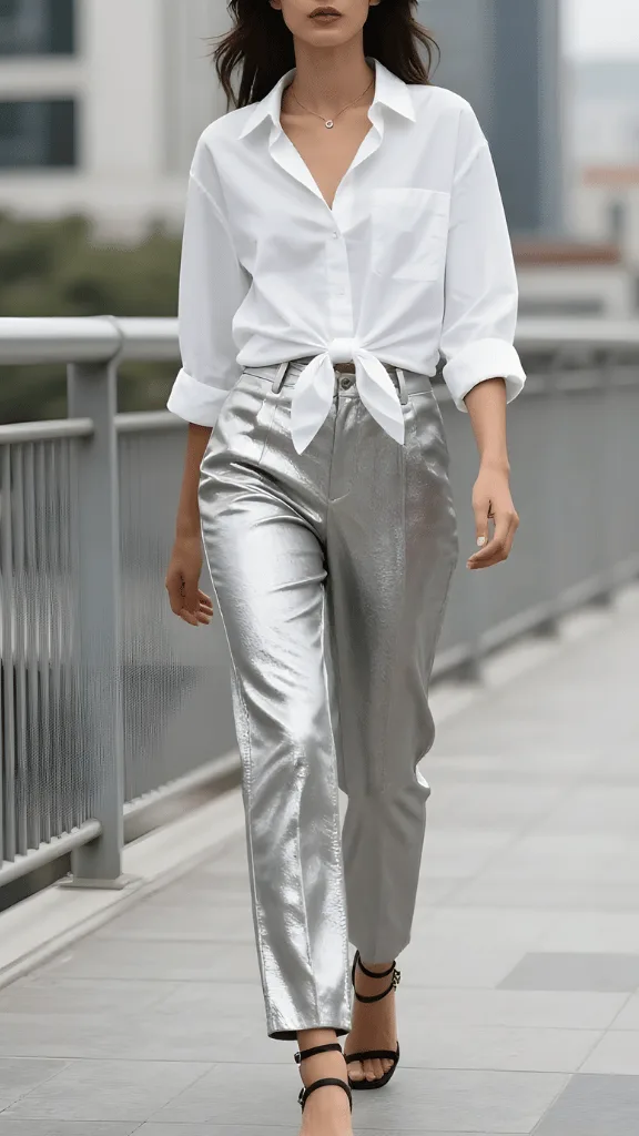 Sometimes the most striking outfits come from unexpected pairings. A classic white button-down shirt tied at the waist meets futuristic silver metallic trousers in this quiet luxury spring outfit 2026 that feels both familiar and fresh. The crisp cotton shirt grounds the look in timeless appeal while the reflective silver trousers add modern edge. This combination proves that elevated basics can coexist beautifully with statement pieces.