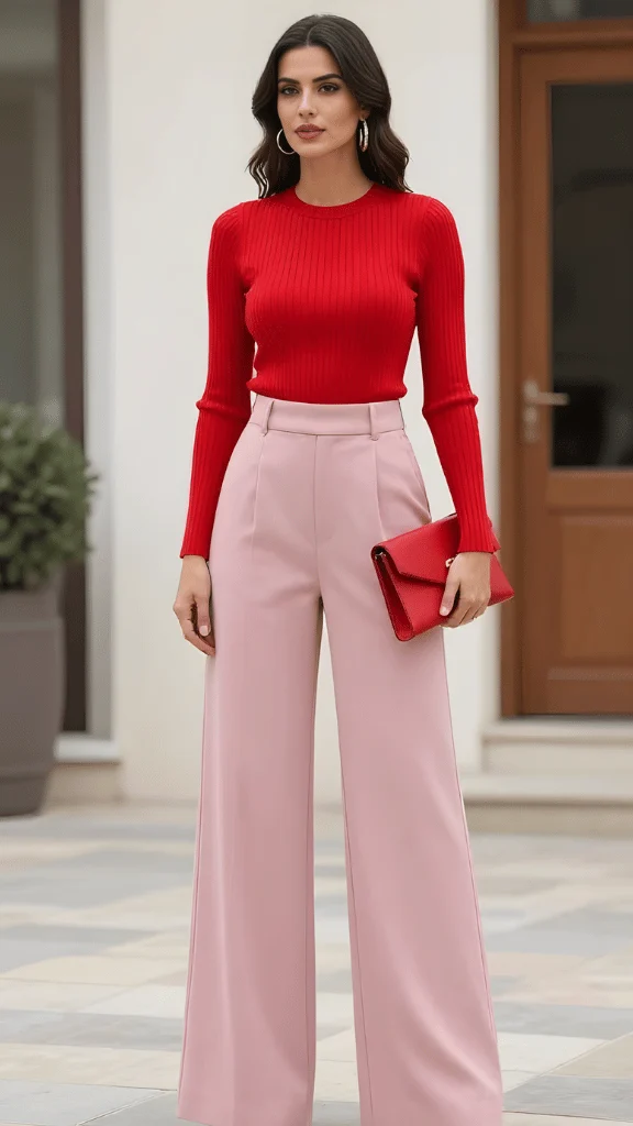 Color blocking enters romantic territory with this stunning pairing of a bright red ribbed sweater and soft blush pink wide-leg trousers. These traditionally feminine shades combine to create a look that feels both bold and delicate. The fitted silhouette of the sweater contrasts beautifully with the fluid drape of the trousers, creating a balanced silhouette that flatters beautifully.