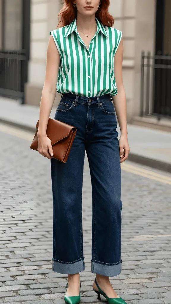 Bold stripes meet classic denim in this stripes with wide cuff jeans spring look that balances statement-making with wearability. The green and white vertical striped sleeveless blouse draws the eye upward while the wide-leg dark wash jeans with generous cuffs create a lengthening lower-body line. Green slingback kitten heels tie the color story together with feminine polish.