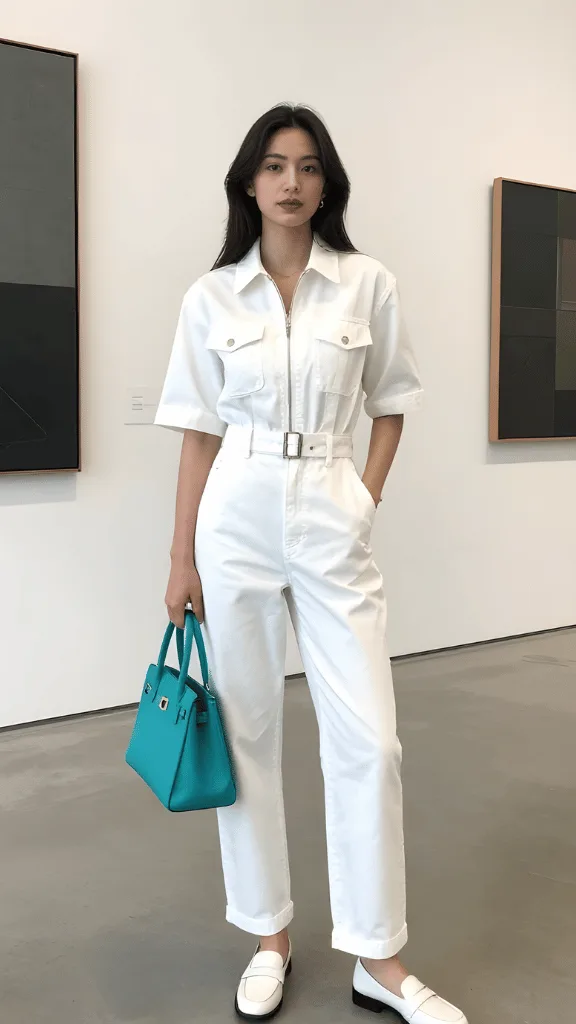 The beauty of a white jumpsuit lies in its canvas-like quality. It serves as the perfect backdrop for colorful accessories, as demonstrated by the striking teal structured handbag that elevates this look from simple to stunning. White loafers maintain the monochromatic base while adding comfort for full days of walking and exploring. This is spring capsule wardrobe for travel perfection.