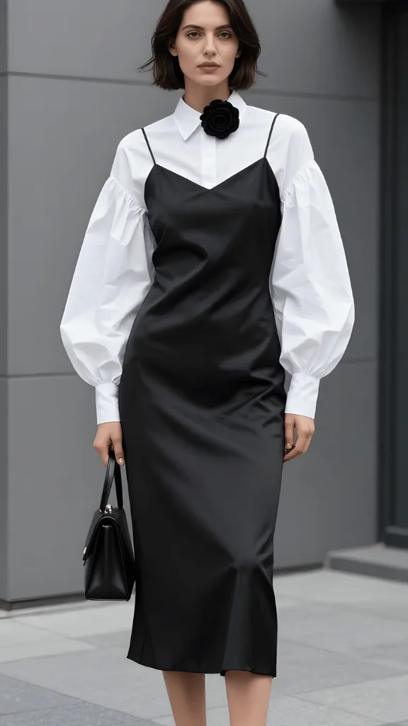 Layering reaches artistic heights with this monochrome black and white slip dress combination that feels equal parts editorial and accessible. A black satin slip dress worn over a crisp white balloon-sleeve blouse creates dimensional visual interest while the black rose accent at the collar adds a romantic finishing touch. This is quiet luxury spring style at its most creative and sophisticated.