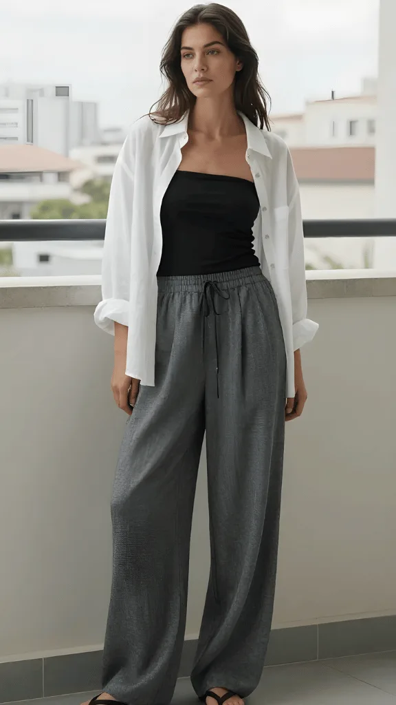 For building a casual spring capsule wardrobe 2026, every piece here serves multiple purposes. The white shirt buttons up for professional settings or layers over swimwear at the beach. The black tank works beneath blazers or alone with shorts. The grey trousers pair beautifully with bright colors or continue the neutral story. This outfit teaches us that the best capsule pieces are those that adapt to endless combinations.