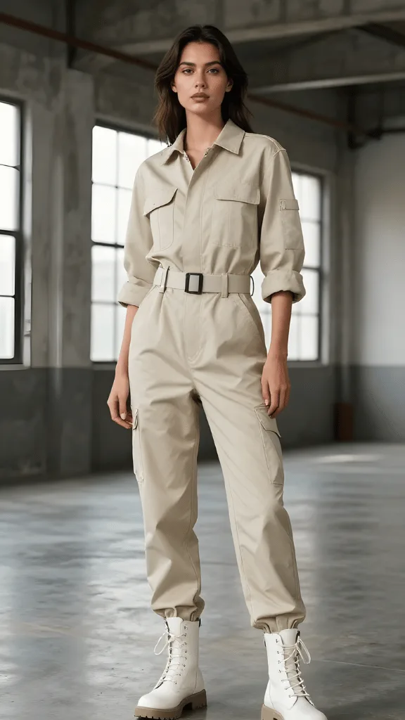 Workwear influences continue to inspire fashion, and this beige belted utility jumpsuit channels industrial chic with refined sophistication. The structured details, including chest pockets, a wide belt, and cargo-style leg pockets, reference functionality while the tailored fit ensures polish. White combat boots add unexpected edge that prevents the look from feeling too predictable.