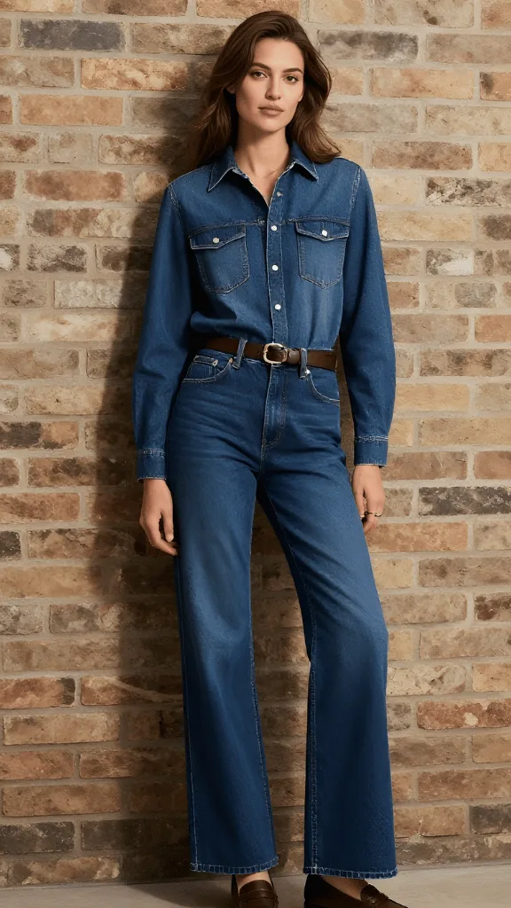 The double denim look sheds its jokey reputation in this refined interpretation that feels thoroughly European and undeniably chic. A medium-wash denim button-down shirt tucked into matching wide-leg jeans creates a unified silhouette that reads as intentional rather than accidental. A dark brown leather belt provides definition and contrast while coordinating with brown leather loafers.