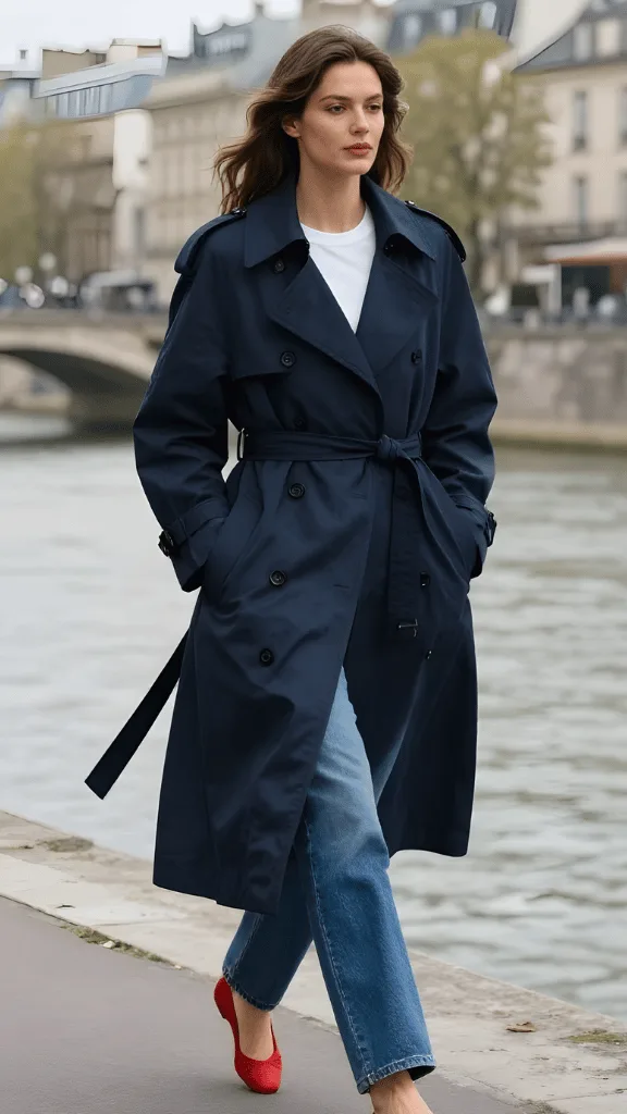 The trench coat remains an eternal spring essential, and this navy iteration brings fresh sophistication to the classic silhouette. Worn over a simple white tee and medium wash jeans, the structured coat elevates casual basics into polished street style. Red pointed ballet flats provide the perfect pop of color that ties the entire look together with Gallic charm.