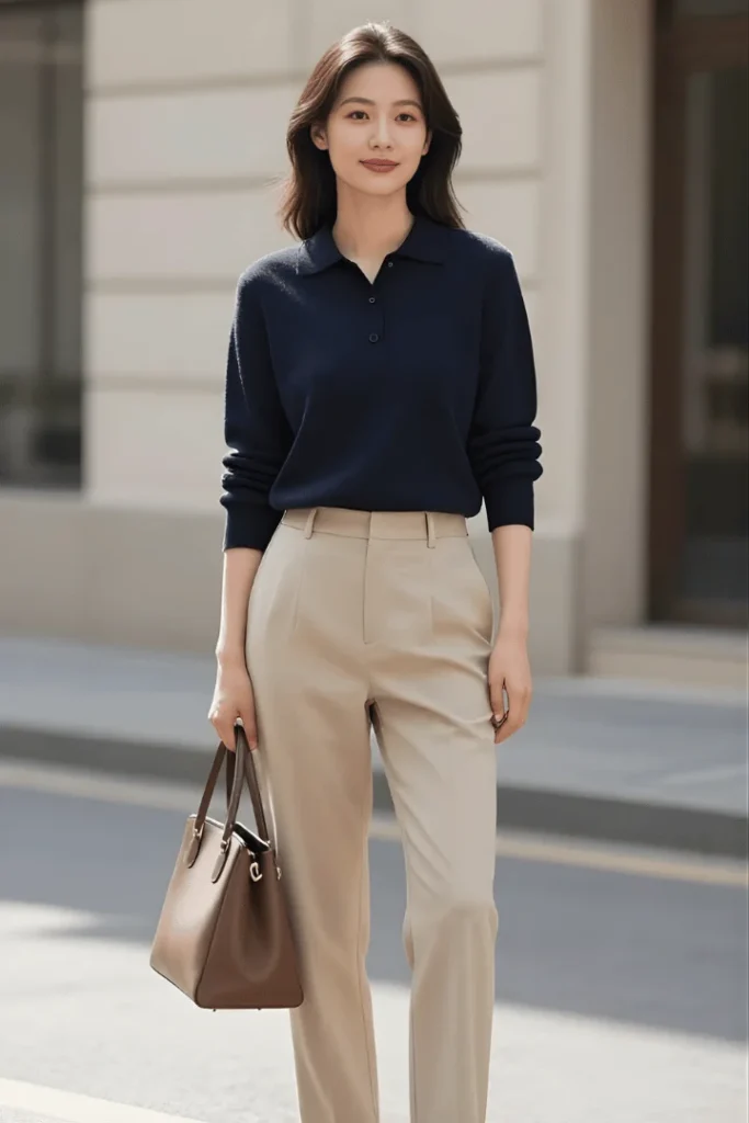 Navy and beige create one of fashion’s most reliable color combinations, demonstrated beautifully in this pairing of a navy polo-style sweater with perfectly tailored beige trousers. The cognac leather bag and matching loafers introduce warmth while maintaining the quiet luxury spring outfits 2026 aesthetic.