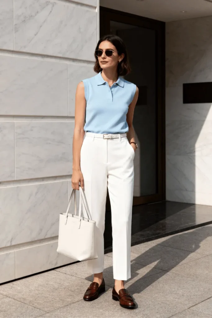 As temperatures warm, this sleeveless knit polo in soft periwinkle paired with crisp white trousers offers the perfect solution for spring outfits for warm and breezy days. The white leather tote and cognac loafers create a fresh, preppy aesthetic that defines classy spring outfits for women 2026.
