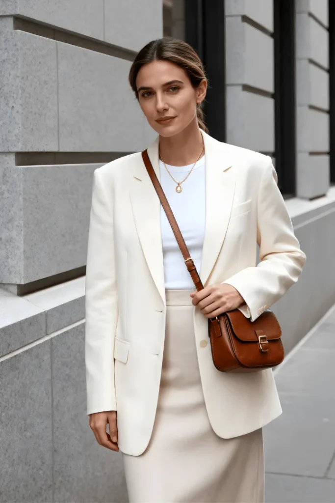 When you need to look polished but approachable, nothing accomplishes this quite like an ivory blazer paired with a flowing satin midi skirt in soft beige. This spring outfits with blazer and trousers adjacent look embodies the sophisticated ease that defines old money spring outfits 2026, proving that structured pieces can feel completely modern and wearable.