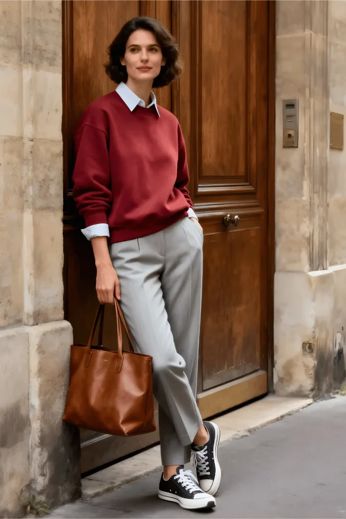 Preppy layering gets a fresh interpretation in this midsize spring outfits 2026 idea that combines a rich burgundy crewneck sweater with a crisp light blue oxford shirt and relaxed grey trousers. The cognac leather tote and classic canvas sneakers ground this look firmly in practical territory while maintaining that old money spring outfits capsule aesthetic.
