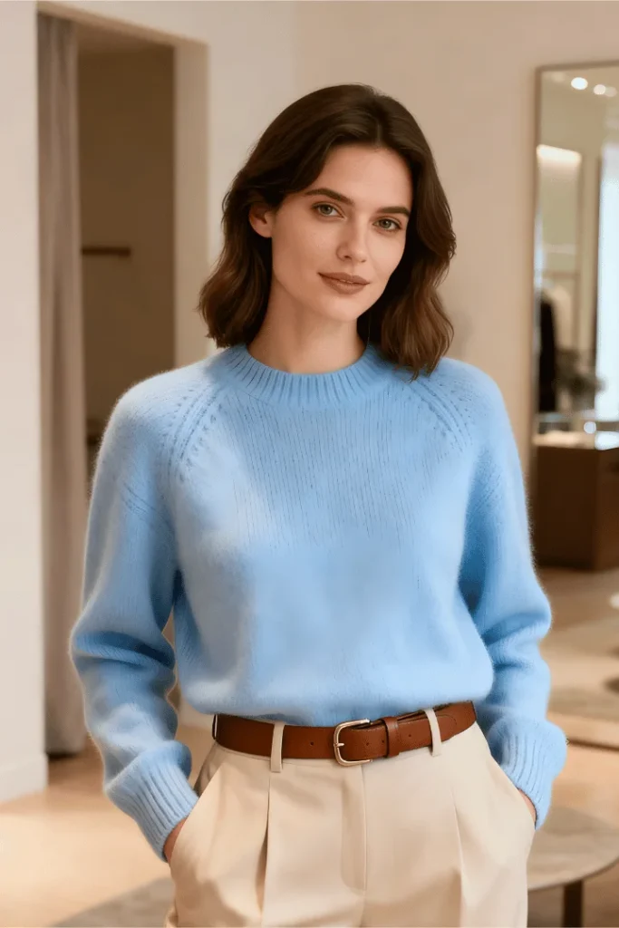Nothing captures spring quite like this dreamy combination of a soft sky blue sweater with cream tailored trousers. The cognac leather belt creates waist definition while introducing warmth to the cool color palette, embodying the accessible elegance that defines quiet luxury spring outfits 2026.