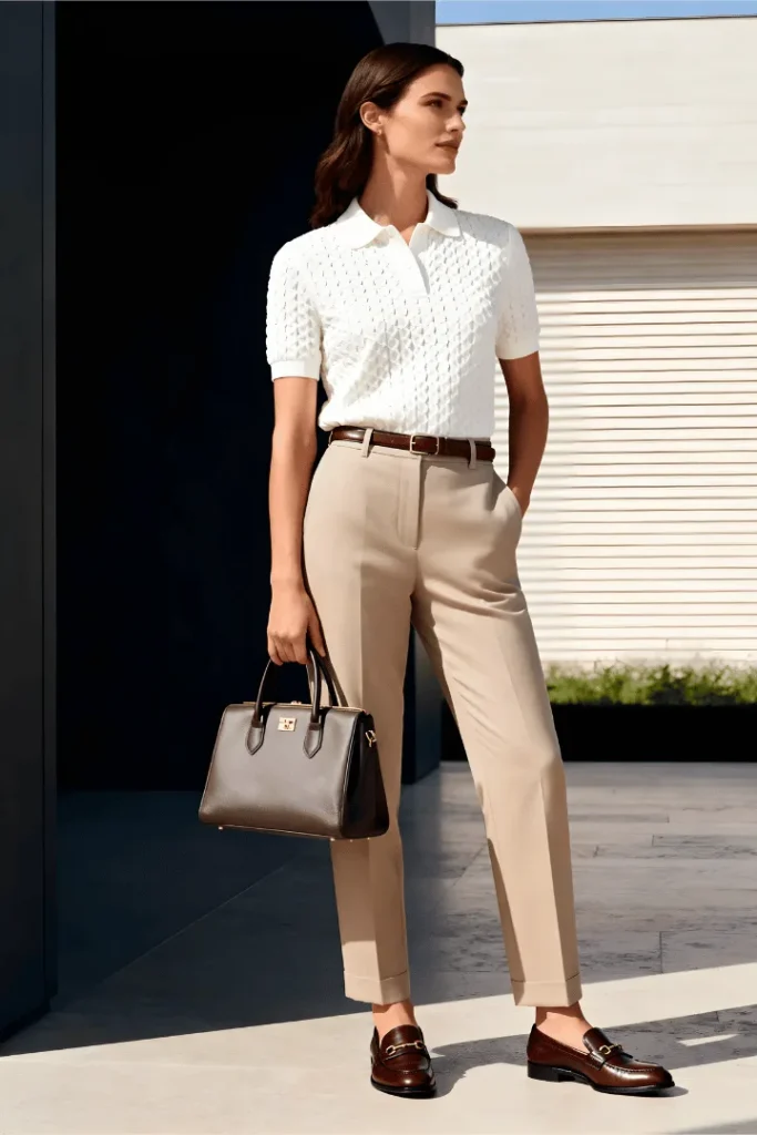 Country club refinement meets modern sensibility in this pairing of a textured white polo shirt with perfectly tailored khaki trousers. The cognac leather belt, matching loafers, and structured handbag create a cohesive accessories story that elevates this midsize spring outfits 2026 cute casual chic look from simple to sophisticated.