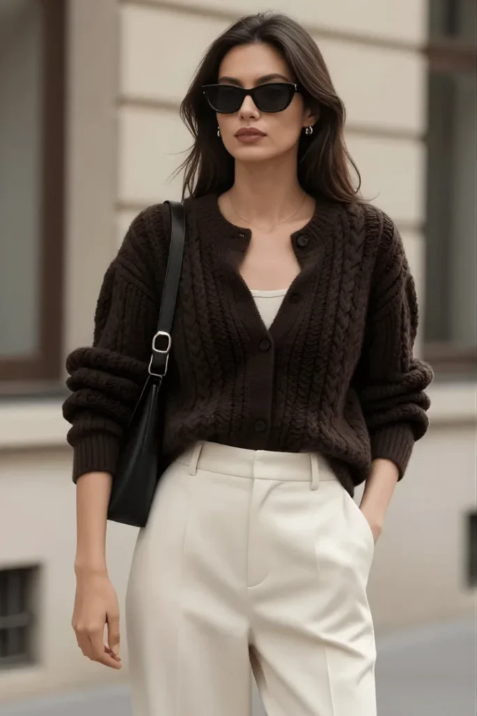 The Dark Chocolate Cardigan with Cream Trousers