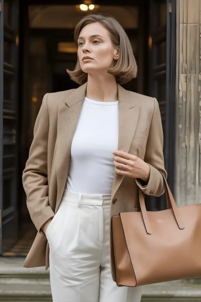 Our collection concludes with perhaps the most versatile combination of all: a beautifully tailored camel blazer worn over white basics with cream trousers. This spring outfits with blazer and trousers pairing represents everything wonderful about old money spring outfits capsule dressing, proving that investment pieces create endless outfit possibilities.