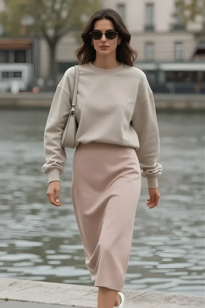 High-low dressing reaches its most elegant expression in this pairing of a relaxed greige crewneck sweatshirt with a sophisticated blush satin midi skirt. This unexpected combination captures exactly what makes quiet luxury spring outfits 2026 so appealing, the confidence to mix casual and formal in ways that feel fresh.