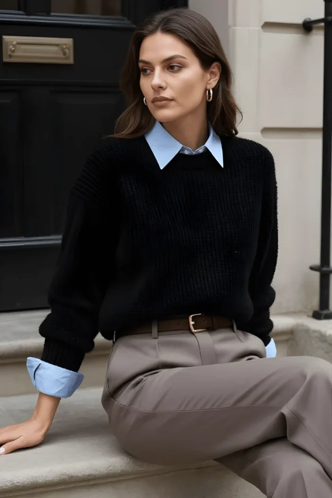 Preppy layering gets a sophisticated update in this combination of a black crewneck sweater worn over a light blue oxford shirt with taupe tailored trousers. The blue cuffs peeking from the sweater sleeves and collar showing at the neckline create thoughtful detail that defines old money spring outfits capsule style.