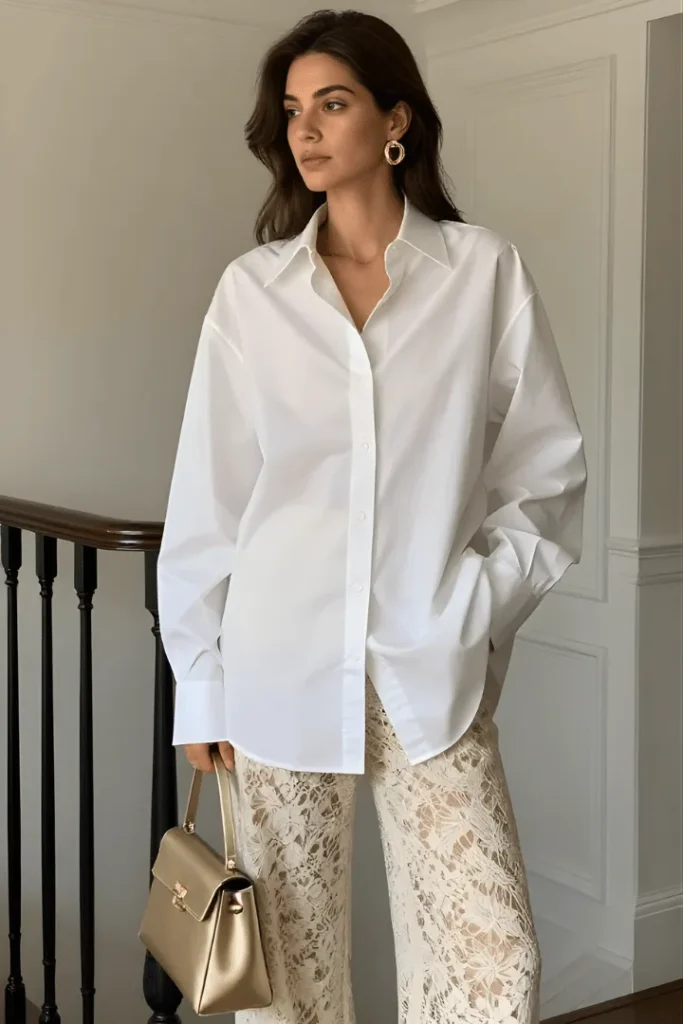 Nothing epitomizes old money spring outfits women casual quite like a perfectly oversized white button-down shirt. This particular styling takes the classic piece and elevates it with unexpected lace trousers in a soft cream tone, creating a look that feels both relaxed and remarkably sophisticated. The gold hoop earrings and structured metallic bag add just enough polish without overwhelming the outfit’s inherent simplicity.