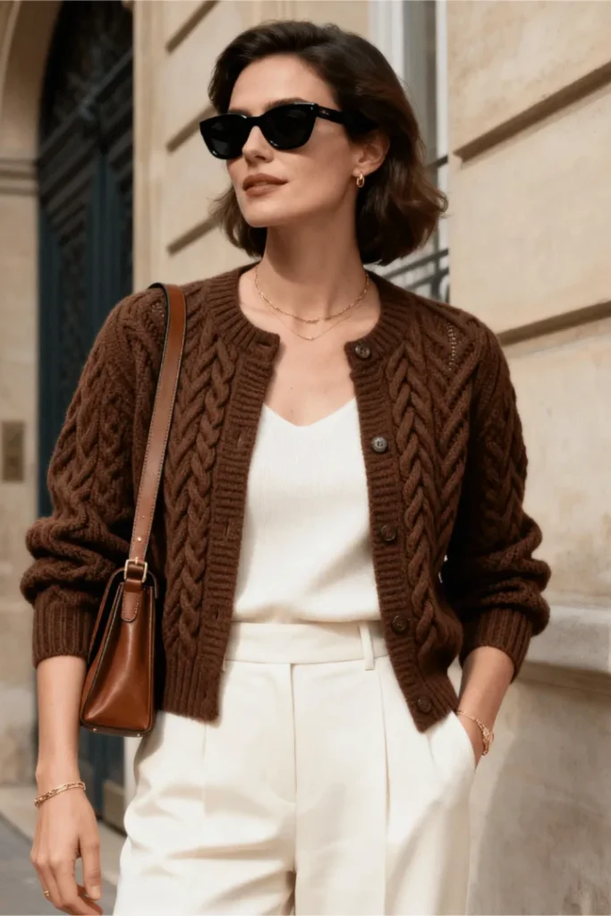 When spring weather can’t quite decide what it wants to be, a chunky cable knit cardigan in rich chocolate brown becomes your best ally. Layered over a simple cream V-neck and matching tailored trousers, this combination captures the essence of quiet luxury spring outfits 2026 while keeping you prepared for temperature fluctuations throughout the day.