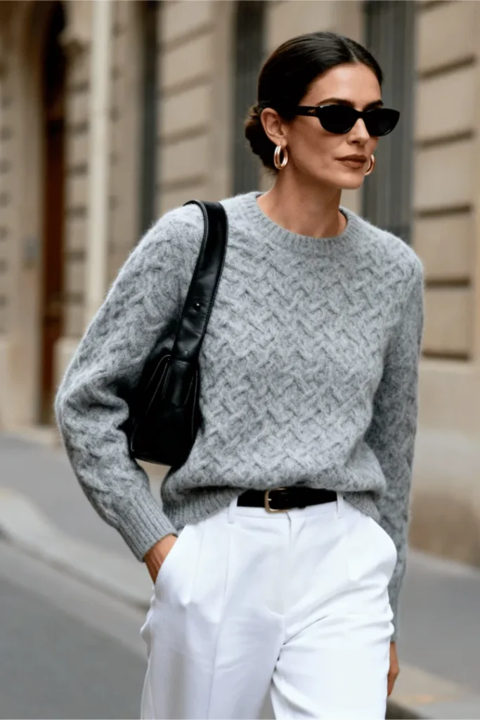 The Grey Textured Sweater with Crisp White Trousers
