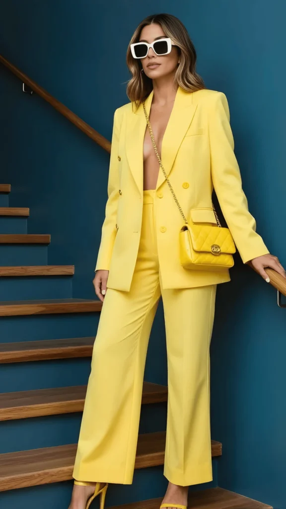 Not for the faint of heart — and absolutely for the bold of spirit. This head-to-toe yellow suit, complete with a matching quilted crossbody bag and strappy heels, is the kind of look that stops traffic. The blazer is double-breasted with a plunging neckline, worn without a top underneath for maximum impact. White oversized sunglasses add a retro-futuristic edge. It’s not what you’d call subtle, and that’s entirely the point.