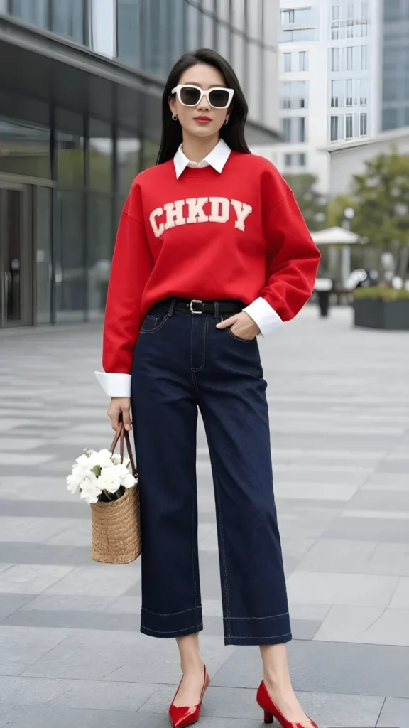 The sweatshirt’s red should be true and saturated — look for quality cotton fleece from brands like Champion reverse weave or even Ami Paris for a more elevated take. The white shirt underneath should have a structured collar that holds its shape when peeking out. For the culottes, wide-leg dark denim from Frame or DL1961 in a rinse wash keeps things crisp. The red kitten heels are the unexpected detail that makes this outfit exceptional.