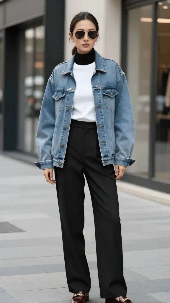 Something about an oversized denim jacket over a fitted white tee and black wide-leg trousers just screams cool without trying. This look plays with proportion in the most flattering way — the volume up top, the streamlined leg below, the whole thing anchored by dark loafers and aviator sunglasses. It’s one of those casual spring essentials that feels simultaneously relaxed and incredibly put together. The layered black turtleneck peeking from beneath the tee adds a subtle texture detail that makes the outfit feel considered rather than thrown on.
