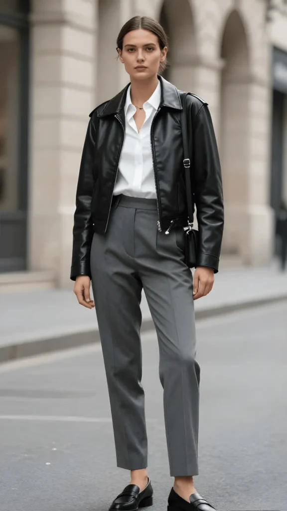There is no spring capsule wardrobe 2026 without a leather jacket — full stop. This look pairs a cropped black leather jacket over a crisp white button-down, tucked loosely into high-waisted grey tailored trousers. The silhouette is sharp but relaxed, the kind of thing you’d see on a woman walking through Milan’s Brera district without a care in the world. The black loafers ground the whole outfit in understated European ease, and a small crossbody bag keeps things functional without cluttering the clean lines. It’s polished without being precious.