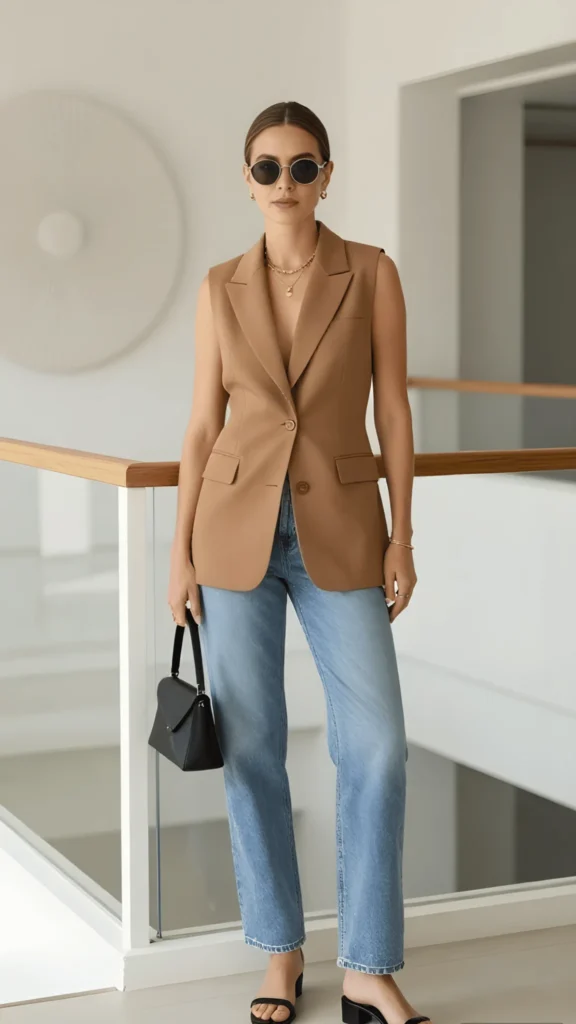 The sleeveless blazer is having its moment and I am here for it. This camel-toned vest worn over nothing but bare skin and light-wash straight-leg jeans is the kind of spring outfit that feels both modern and classic. The warm tan plays beautifully against the cool blue denim, and the structured shoulders of the vest create a strong, elegant silhouette. Round sunglasses, a delicate gold necklace, and a black structured handbag complete the look with European minimalism at its finest.