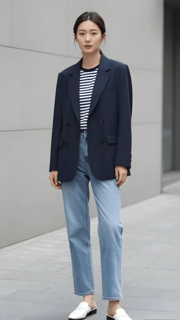 Few combinations feel as inherently European as a navy blazer thrown over a Breton stripe tee with light-wash straight-leg jeans. This look absolutely nails the balance between dressed-up and dressed-down that defines the best spring capsule wardrobe outfits. The blazer has a slightly oversized, double-breasted cut that keeps it modern rather than corporate, and the white mules at the bottom add just enough polish to elevate the denim. It’s the kind of outfit that works in Seoul, in Stockholm, in San Francisco — anywhere women value smart simplicity.