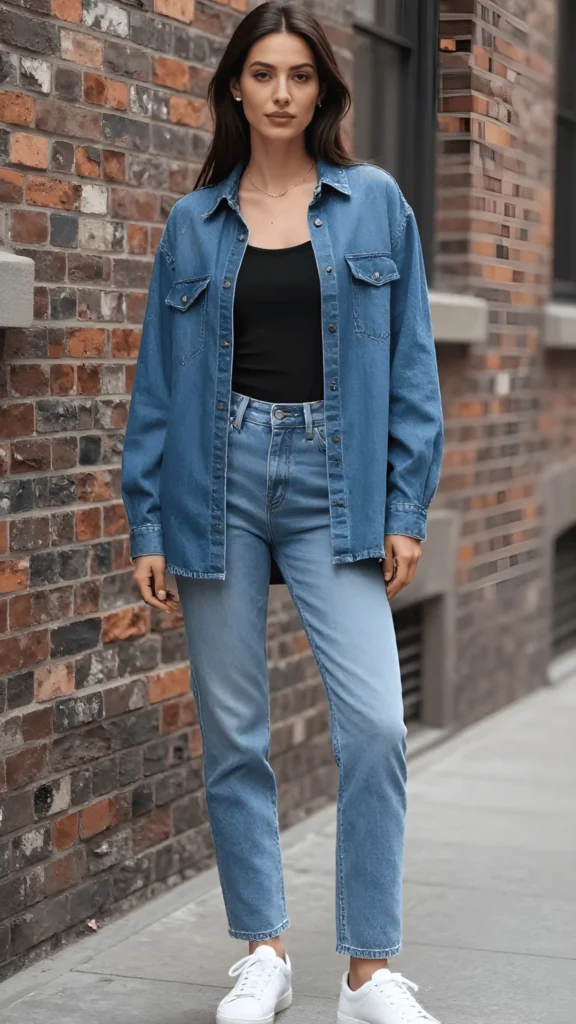 Double denim has earned its place in the pantheon of casual spring essentials, and this version gets it exactly right. An oversized denim button-down shirt worn open over a fitted black tank top, paired with light-wash straight-leg jeans and clean white sneakers. The shades of denim are similar but not identical, which creates a tonal effect that feels cohesive rather than costumey. A thin gold chain necklace adds the smallest touch of refinement. The backdrop — a brick wall, city sidewalk — tells you exactly where this outfit belongs: walking through the real world, looking impossibly good.