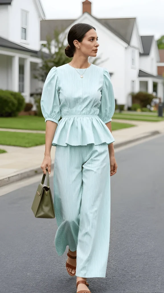 There’s something deeply elegant about a matching set in a soft, pastel shade, and this mint green peplum ensemble is a perfect example. The top features gentle puff sleeves and a defined peplum hem that creates a beautiful feminine waistline, while the matching wide-leg trousers flow with every step. The color is pale and dreamy — almost like sea glass. Brown leather sandals and an olive-toned structured bag add warmth and prevent the pastel from reading too sweet.