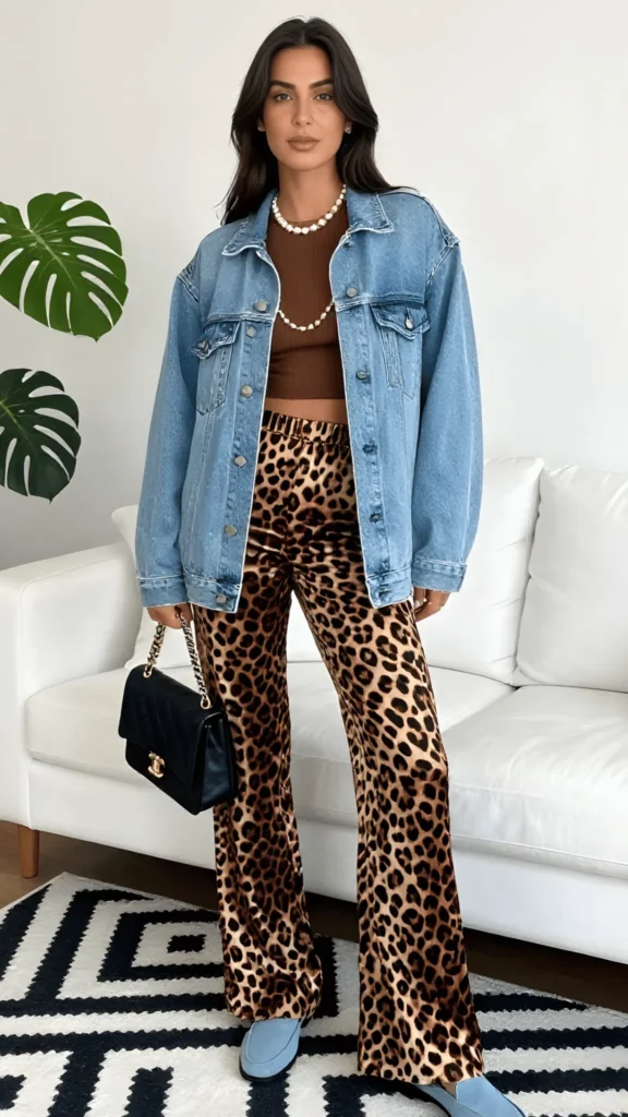 Leopard print can go wrong fast, but when it’s styled like this — with intention and balance — it becomes one of the most exciting elements in a spring wardrobe. These wide-leg leopard print trousers are paired with a fitted brown ribbed crop top that echoes the warm tones in the print, and then the whole look is grounded by an oversized light-wash denim jacket draped over the shoulders. A pearl necklace adds unexpected polish, and a black Chanel-style quilted bag pulls it all together. It’s bold, yes, but it’s controlled.