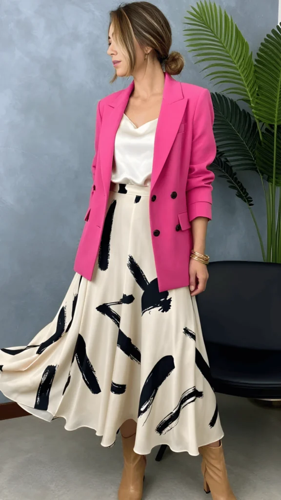 If there’s an outfit in this capsule that makes me want to cancel all my plans and just walk around looking incredible, it’s this one. A hot pink double-breasted blazer over a cream satin camisole, tucked into a flowing midi skirt with bold black brushstroke prints. Tan leather boots at the ankle add an unexpected warmth. The whole thing feels like art — joyful, expressive, and completely confident. This is a light European outfit that could work at a gallery opening in Berlin or a lunch date in Barcelona.