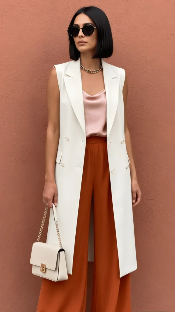 This outfit feels like a sunset distilled into clothing. A long cream double-breasted sleeveless vest falls over a blush pink satin camisole, paired with terracotta wide-leg trousers that move like water. The color palette — cream, rose, and burnt sienna — is warm and incredibly sophisticated. Round dark sunglasses, a gold chain necklace, and a cream structured bag with a chain strap complete the look. It’s a light European outfit that could hold its own at a rooftop dinner or a Saturday stroll through an open-air market.
