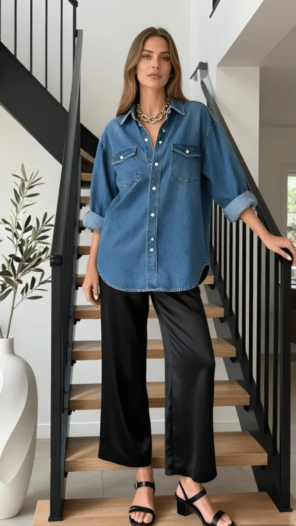 The contrast of textures in this outfit is what makes it sing. A classic medium-wash denim button-down shirt, cuffed at the sleeves, is tucked loosely into flowing black satin wide-leg trousers. The denim is workwear-rugged; the satin is evening-luxe. Together, they create something entirely new — casual but elevated, daytime but date-night-ready. A chunky gold chain necklace and simple black strappy sandals tie the look together. It’s standing on a staircase looking like it belongs in a magazine editorial, yet everything about it is completely wearable.