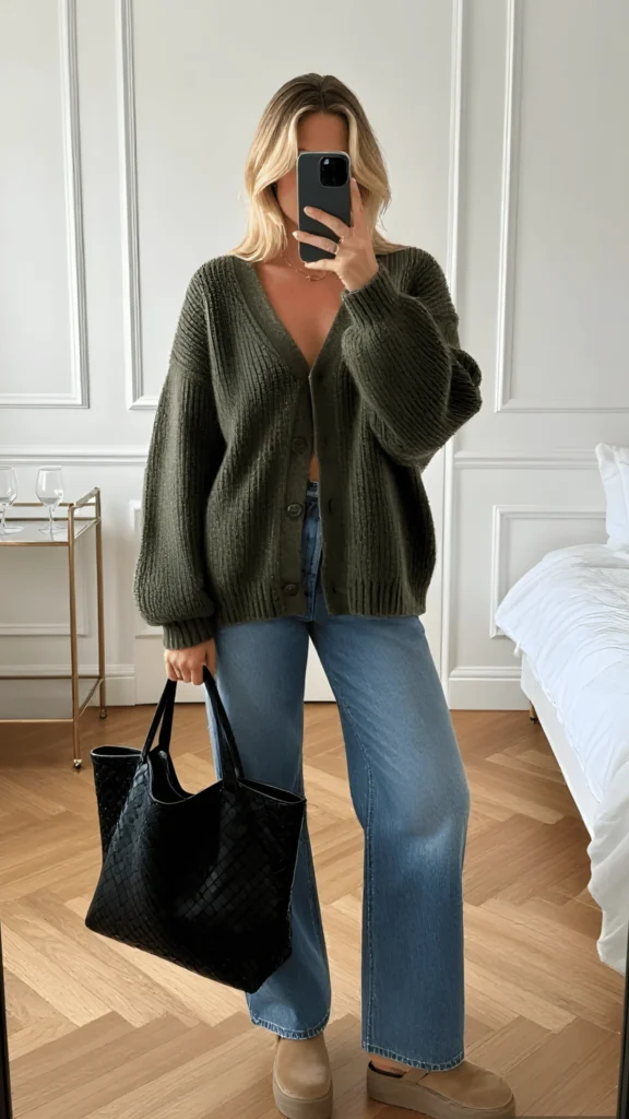 There are days when you want to feel like you’re wearing a hug, and this outfit was made for exactly those days. An oversized olive green ribbed cardigan, worn open and slightly slouchy, is paired with medium-wash wide-leg jeans and chunky platform Ugg-style boots. A large black woven tote bag — reminiscent of the Bottega Veneta intrecciato — adds a luxe touch. The whole look is cozy, intentional, and deeply autumnal in mood, but it works beautifully for those cooler spring mornings when the season is still making up its mind.
